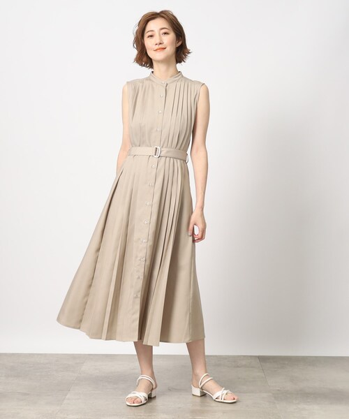 プリーツデザインが目を惹く着映え間違いなしのオシャレワンピース【デザイン】身頃にたっぷり入ったプリーツデザインが魅力的なワンピース。華奢なスタンドネックが上品さを際立てます。共布ベルト付きで、シルエットのアレンジがきき、着こなしの幅が広がります。金属のDカンが大人っぽいモダンなアクセントにもなっています。ノースリーブデザインなのでカーディガンなどの羽織スタイルも袖のもたつきなくスマートに着こなせます。※ポケットなし【素材】光沢が美しいシャンブレー素材を使用しています。さらっとした肌触りで春夏にぴったりの素材感です。こっくりとしたブラウン(042)と、リネンのようなナチュラルカラーをイメージしたライトベージュ(051)、デニム見えするブルー(092)の3色展開です。※裏地なし※ライトベージュ(051)はやや透け感があるため、インナーの着用をおすすめします。【スタイリング】足元の変化でカジュアルにもキレイメにも様変わりする着回し力の高いワンピースです。アレンジの効くDカン共布ベルト付き。ウエストを絞らずフレアシルエットのまま着用頂いても良いですし、ベルトでウエストマークした女性らしい着こなしもおすすめです。高身長の方はパンツをレイヤードしてラフな着こなしにアレンジしても素敵です。こちらの商品は主に秋に着用いただける商品です。モデル情報:身長166cm B80 W59 H86 着用サイズ:02(M)店舗へのお問い合わせ商品番号:768-57006●製品寸法:01(S):着丈118cm B85cm 肩幅37cm アームホール18cm02(M):着丈120cm B88cm 肩幅38cm アームホール19cm03(L):着丈122cm B91cm 肩幅39cm アームホール19cm04(LL):着丈124cm B94cm 肩幅40cm アームホール20cm05(3L):着丈125cm B97cm 肩幅41cm アームホール20cm備考: