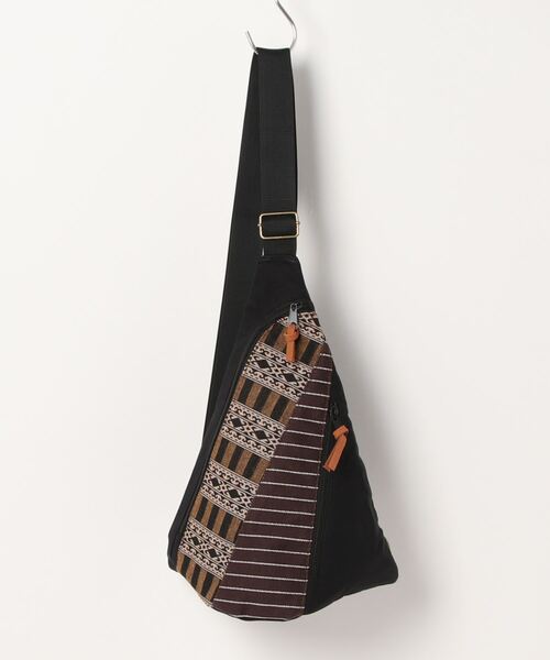 無地をベースに、ストライプ柄と幾何学模様の異素材を組み合わせた、個性豊かなパッチワークが目を惹くバッグ。 幾何学模様は「英雄的な力強さ」「繁栄」「豊穣」などを意味するトルコの伝統織物・キリムの『羊の角』をイメージしたジャカード生地を使用。 ティピーのような形が印象的なボディバッグです。 カジュアルコーデやフォークロアスタイルのアクセントに◎ ・表面にファスナー付きポケットあり。 ・裏地付き。 ・ショルダーベルトで長さ調節可能。 ・内側の色味は全カラー同色です。 ・ショルダーベルトの先端はロブスターフックになっていますので、裏面両サイドにあるDカンへの取り付け位置により、右利き左利きどちらでも使いやすい仕様になっています。 ※こちらの商品は1点1点職人による手作りとなります。その為、生地の取り方により柄の配置や形・色合いなど若干異なる場合がございます。あらかじめご了承ください。 ※屋外での撮影画像は、光の当たり具合で色味・カラーが違って見える場合がございます。商品のカラーは、スタジオ撮影の画像をご参照ください。 <価格改定のお知らせ> 2024年6月11日より、素材費高騰の諸事情により価格改定をさせて頂きます。 商品タグに記載している価格につきまして、旧価格のものが混在している場合がございます。 ご了承くださいますよう、お願い申し上げます。 Amina Collection Co.,LTD.