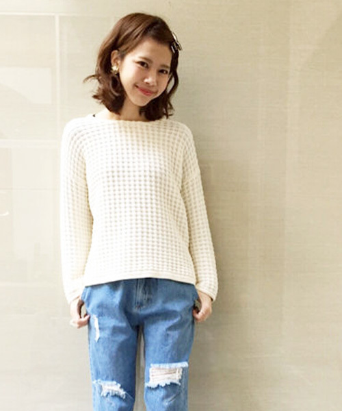 Kastane(カスタネ) 編み模様がポイントのニットは春カラーを揃えました。前後で丈が違い、後ろ身頃は少し長くなっています。ベーシックなボトムスから今年人気の半端丈パンツや太パンツとも相性が良いです。