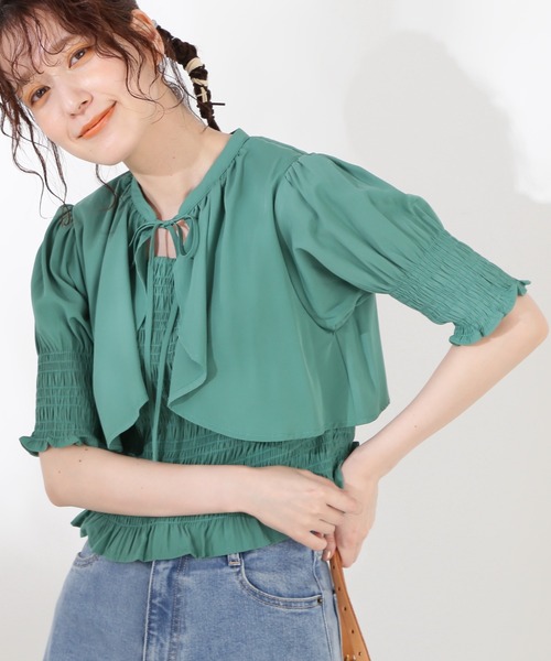 ボレロをレイヤードしたように見せるドッキングブラウス。身頃と袖口はシャーリングデザインでシルエットをすっきりまとめ、裾はインもアウトもボトムのデザインによって着用いただけます。ラッフルフリルや襟ぐりのリボンで抜け感をだした、ボレロデザインはトレンド感もあって、一枚でサマになるアイテム。**********************透け感:なし裏地:なし伸縮性:あり光沢感:なし生地の厚さ:普通**********************【スタッフ着用コメント】身長:159cm/体型:普通/普段サイズ:M/着用サイズ:Mボレロデザインがポイントの1枚着るだけでサマになるデザインブラウスです☺︎身頃がシャーリングのゴムで程よくフィット感がありボレロのデザインとメリハリをつけられます。袖周りもシャーリングで締め付け感少なくスッキリと着られます。ジャストな丈感なので、ボトムスにインしなくても良いので着こなししやすいです!甘めなデザインなのでパンツスタイルですと程よく甘さを抑えられるのでオススメです。とろみのあるテロっとした素材で夏場も涼しくシワもつきにくいと思います!