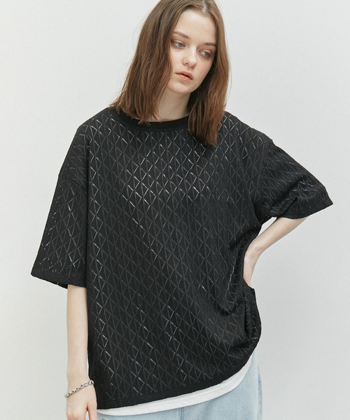 【 イージーケア 】透かし柄アンサンブルTシャツ■素材、機能アウターのレース素材は清涼感抜群のサラリとしたタッチ感と通気性があるので軽快で涼しい印象です。インナーのTシャツは伸び感とソフトなタッチの天竺なので着心地抜群です。■シルエット、デザイン表情のある素材感でリラックスして着用できるサイジングにしたアンサンブルTシャツです。真夏でも暑くないようなタッチ感、清涼感ある印象と素材を厳選して仕様しているので快適性とトレンド感を一枚で決まるアイテムです。■カラーモノトーンでクリーンな印象がある2色展開です。■スタイリングスリムなイージーデニムと合わせた王道のカジュアルコーデがおすすめです。綺麗めなスラックスでカラートーンを合わせたモードカジュアルも今年らしさ演出できます。裏地:なし透け感:なし伸縮性:あり生地感・厚さ:普通ポケット:なしその他仕様:なし【モデル着用サイズ】WOMEN:身長172cm 着用サイズL※撮影場所やライティング、お使いのモニター環境によって色の見え方が異なる場合がございます。※商品のカラーは詳細画像の色味をご参照ください。