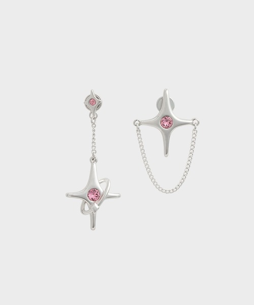 左右で異なるアシンメトリーなデザインが可愛いピアス。片方は星形にチェーンを繋ぎ合わせ、真ん中に大きめのクリスタルをトッピング。 もう片方は、キャッチ部分から繋げた星形のモチーフがゆらゆらと揺れるフェミニンなデザインです。 カジュアルにもフェミニンにもフォーマルにも。 様々なシーンやコーディネートに使える一品です。