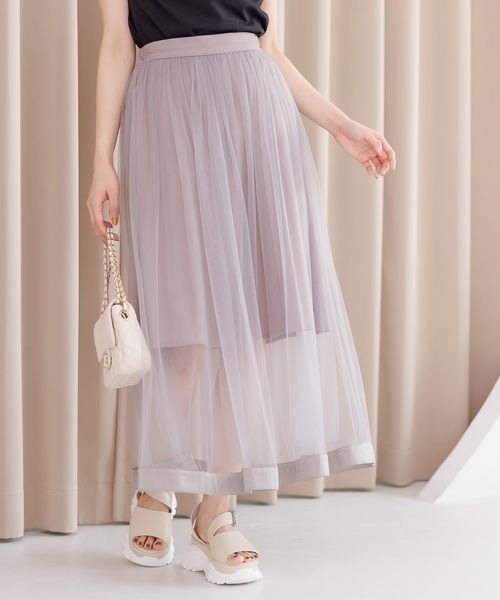 着映え間違い無し!華やかな雰囲気のチュールフレアスカートです■point・裾に施されたサテンラインがポイント・ふわっと広がるフレアーラインが女性らしく華やか・ウエスト後ろはゴムで楽な履き心地・裾の透け感で軽やかで涼し気な印象■styling綺麗めなスカートなのでカジュアルなTシャツと相性◎もちろんブラウスやシャツ、綺麗めアイテムとの合わせもミスティウーマンらしい装いに。トップスはスッキリと、コンパクトなものを選ぶことでフィット&フレアーなシルエットが完成されスタイルアップ効果も期待♪※屋外の光や照明の当たり具合で、実際の商品の色味とカラー別画像の色味に若干の違いが発生する場合がございます。 詳細画像と併せてご確認の上、ご注文いただきますようお願い致します。【INFORMATION】■商品のお気に入り登録完売していても再入荷時に再入荷通知を受け取ることができますので、是非ご登録ください!■ブランドのお気に入り登録新商品や再入荷などの情報を受け取ることができますので、是非ご登録ください!※ご注文いただいた予約商品のお届け時期の確認は、注文履歴ページより行えます。