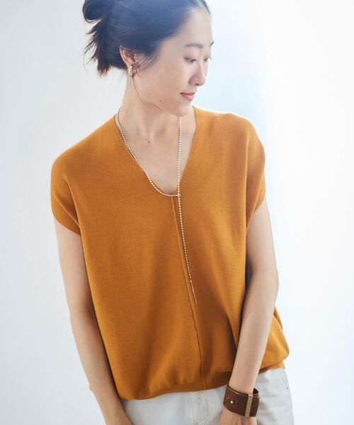 【身体に張り付かないゆとり感】 丸みがあるラインが特徴のコクーンシルエットニットプルオーバー 一枚でキマるデザインプルオーバー。Vネック仕様で程よい抜け感を表現できます。 編み地が横にはしるガーター編みで、シンプル過ぎない編み地にしているのもポイント。 肩のラインが隠れきるフレンチスリーブ袖丈で一枚で着ても安心感があり、コクーンシルエットによって生み出されるゆとり感が夏場にサラッと着こなすスタイルにピッタリです。 スカート・パンツ共にスタイリングの相性抜群です。 ==================== 透け感:(オフ)若干あり 伸縮性:あり 光沢感:なし 生地の厚さ:やや薄手 ==================== 【スタッフ着用コメント】 <スタッフA> 40代前半/156cm/骨格ストレート/普段サイズS/着用サイズ36 サイズ感:ややゆとりあり。 素材感:柔らかく着心地◎ 着用感:短めのお袖ですが、絶妙に二の腕が気になりにくいデザインです。着丈は長めですが前後差があるので、ボトムを選ばずバランスが取りやすいです。 ※商品はサンプルで撮影しております。 実際の商品と仕様、加工、サイズが若干異なる場合がございます。