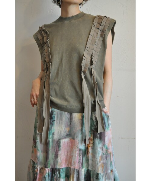 製品染めならではの絶妙な色合いが特徴的なミニ裏毛トップス。 ステッチのアタリがイイ感じにヴィンテージ風の味を出しています。 ランダムタックにしたテープで凹凸感を出し、敢えて長く垂らして動きのあるデザインにしたフレンチスリーブです。