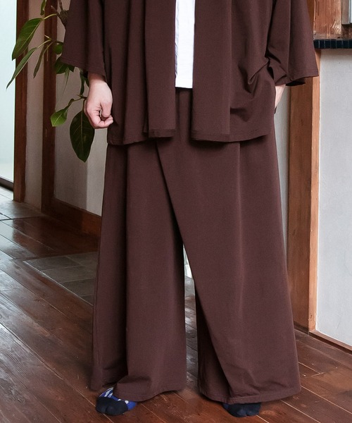 涼やかで肌ざわりの良いカットソー生地のワイドパンツ。 湯上りに楽に穿けるような生地感で、リラックス感のある穿き心地。 前を少し重ね合わせたような斜めに入った巻きパンツ風シルエットが印象的で、無地ながら存在感のあるデザインです。 ゆったりとしたシルエットでメンズはもちろん、ユニセックスでご着用いただけます。 ◆カヤ◆ 古くから伝わる日本の伝統と新しい文化の融合。 「新しいカタチの日本」に出会える倭物ブランド【カヤ】 「文明開化」をテーマに、倭モダンで色彩あふれる刺激的な和雑貨を提案していきます。 ※こちらの商品は1点1点職人による手作りとなります。その為、形や色合いなど若干異なる場合がございます。あらかじめご了承ください。 ※屋外での撮影画像は、光の当たり具合で色味・カラーが違って見える場合がございます。商品のカラーは、スタジオ撮影の画像をご参照ください。 Amina Collection Co.,LTD.