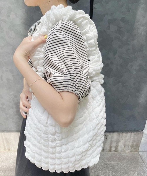 ポップコーンのようなポコポコ生地がかわいいバッグ♪大きめサイズで使いやすく、幅広いシーンに活躍するアイテムです。ショルダーのシャーリング部分はアジャスターで調節できます♪内側には収納ポケットが2つとチャック付きのポケットが1つあるので小さな小物の収納にも便利です♪マチもあるのでたっぷりと荷物が入ります。何にでも合わせやすいホワイトカラーがデイリー使いにぴったりです♪【お買い物を上手にお楽しみいただくためのPOINT2つ】◎ 購入ボタン横の ♡ (ハートマーク)をクリック! 完売カラーの再入荷通知、残り1点の通知、セールの通知を受け取れます。 (クリックまたはタップで商品のお気に入り登録♪)◎ ショップのトップページにある ♡ (ハートマーク)「お気に入りショップに追加」をクリック! 新商品や再入荷等、いち早くブランドのお得な情報を受け取れます。 (ブランドのお気に入り登録♪)