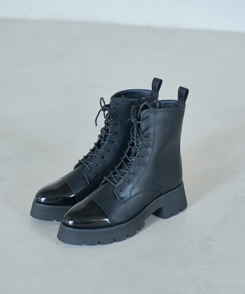 見た目以上の軽量感が嬉しい厚底レースアップブーツ!【デザイン・シルエット】 トウ先の切り替えデザインで、ツヤっとガラス調の生地がポイントです。 足が綺麗に見える程良い細めのラウンドです。 厚底ですが見た目以上の軽量感で、長時間歩く日の1足としてもおすすめです。 つま先には抗菌防臭生地を採用しております。 【カラー】 どんなスタイリングにも合わせやすいブラック。 ※サイズスペックはサンプルLサイズ・両足の測量になります。サイズによって多少異なる場合があります。 ※画像の商品はサンプルです。 実際の商品と仕様、加工、サイズが若干異なる場合がございます。
