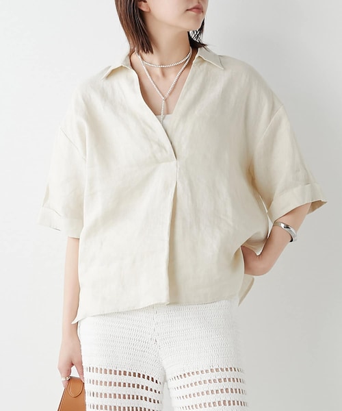 シーズンムードを高めるこなれリネンシャツ●涼しげなリネン素材が魅力のスキッパーシャツ。●程よく体が泳ぐ、抜け感のあるサイジング。●顔周りをすっきりと見せてくれるスキッパーネック。●裾は後ろに向けて緩やかに広がる、丸みを帯びたフレアシルエット。●サイズ感を活かしてキャミワンピの上からレイヤードするのもおすすめ。■洗濯:手洗い可■透け感:ややあり■裏地:なし▼着用関連商品 クロシェパンツ 【TONY BIANCO】パデットスクエアトゥミュール / ANGEL※画像の商品はサンプルです。 実際の商品と仕様、加工などが若干異なる場合があります。 予めご了承ください。※トップの画像は、光の具合で色味が違って見える場合があります。 商品の色味は、スタジオ撮影の画像をご参照ください。