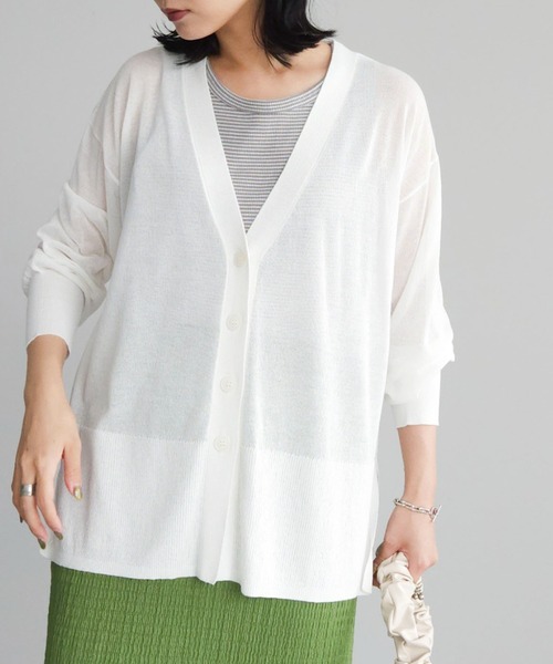 COOL TOUCH FABRIC 触れるとヒンヤリする接触冷感シリーズが今年も登場!!ふれるとひんやりと感じる接触冷感機能が嬉しいVネックカーディガン。袖口や裾の幅広リブの切替も、スタイリングにメリハリ感をプラス。裾サイドにはスリットを施し、軽やかな印象を与えてくれます。シンプルなデザインで着回し力も高く、様々なスタイリングにもバランスよくマッチしてくれるアイテムです。透け感[有り] 裏地[無し] 伸縮性[有り] 光沢感[無し] 生地の厚さ[薄手] 付属品[無し] ポケット[無し] 接触冷感シリーズ一覧はこちら●製品寸法:F:バスト59cm 着丈63.5cm 袖丈48cm 肩幅55cm 裾幅57.5cm備考: