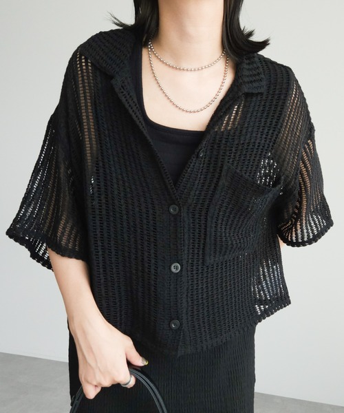 繊細なメッシュレースで軽やかな印象に仕上げたシャツ。ほんのりとした透け感がセンシュアルで大人っぽい印象を演出。ボクシーなシルエットで華奢見せ効果も期待することができます。コーディネートに取り入れるだけでも、旬なスタイリングが楽しめるアイテムです。透け感[有り] 裏地[無し] 伸縮性[やや有り] 光沢感[無し] 生地の厚さ[普通] 付属品[無し] ポケット[無し]●製品寸法:F:バスト58cm 着丈50cm 袖丈19.5cm 肩幅56cm 裾幅57cm備考: