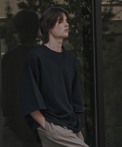 【 Oversized Double Rib Design T-shirts / オーバーサイズダブルリブデザインTシャツ 】 shiki tokyo 2023 Summer Collection Vネックにクルーネックがレイヤードされたような斬新なデザインが特徴的な1枚 オリジナルで染めた生地で夏の主力アイテムに! [素材 / デザイン] 270g/㎡のT/C(ポリエステル/コットン)素材 程良いウエイトがありながらも表面感は綺麗な質感で肌触りの良い素材です。 オリジナルで生地を染め、今作のラインナップにマストな4色にて展開しております。 シンプルで変化の出しづらいTシャツながらも Vネックリブの内側にクルーネックのリブをレイヤードさせ、 首周りに変化のあるデザインとして落とし込みました。 また、袖先をロック始末をすることで、カジュアル感をプラスしております。 スペックは身幅、肩幅、袖幅を広げたオーバーサイズシルエット。 一枚でデザイン性を感じる1枚ながらも 着こなしのしやすいアイテムです。 1枚はもちろんのこと、秋などにはインナーとしても活用でき 様々なボトムスとの組み合わせがしやすい一品です。 販売価格も4,500円(税込4,950円)と生地の染色から行ったことで、 コスト面を抑えることができコストパフォーマンスに優れたアイテムとなっております。 カラー展開:ブラック、チャコールグレー、ターコイズブルー サイズ展開:S / M / L ※屋外での撮影画像や光の当たり具合で色味が異なって見える場合がございます。 商品の色味はスタジオでの詳細画像をご参照下さい。 [ shiki tokyo ] "liberty&creativity" 「リラックス・リアルクローズに"ファッションの自由な発想とモードなクリエイティブを」 "shiki"を通して、柔和な雰囲気の中にもこだわりのある服を。 ▼商品のお気に入り登録 完売カラーの再入荷通知や、ラスト1点、セールの通知をお知らせ致します。 ▼ブランドのお気に入り登録 新商品や再入荷など、いち早くブランドの情報を受け取ることができます。 是非ご利用頂き、お買い物をお楽しみ下さい。