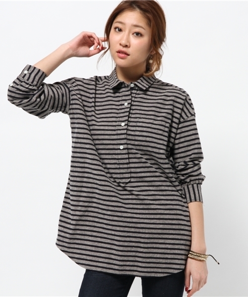 Spick & Spanではお馴染みのブランド“Leclair(レクラ)” ボーダーが目を惹くプルオーバー型シャツ 1枚はもちろん、これからの季節はプルオーバーのニットやカーディガンを合わせ、レイヤードを楽しんで♪ 広がり過ぎないきれいなシルエットも人気の秘訣!