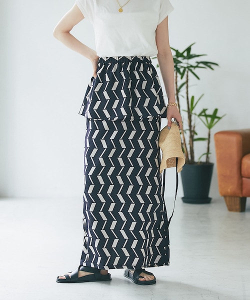 着こなしの幅が広がるペプラムスカート●POINT・取り外し可能なペプラム付のスカート・華やかな幾何学模様のプリントで個性をプラス・タイトすぎずラインを拾いにくい●デザイン抽象的な幾何学模様がコーディネートのアクセントになるスカート。ペプラム部分は取り外し可能になっており、ベアトップとしても着用いただけます。ペプラムスカート、タイトスカート、ベアトップとのセットアップ等着こなしの幅は自由自在。タイトすぎないシルエットで気負わず着用いただけ、デイリー使いしやすいのもポイント。1枚で着映えするので、シンプルなコーディネートでも華やかさをプラスしてくれるアイテムです。●おすすめコーディネートモード感のある幾何プリントはカジュアルなカットソーとの相性が◎シンプルにTシャツやタンクトップと合わせても様になるのでおすすめです。お手持ちのGジャンやブルゾン、デニムシャツなどのアイテムともしっくり決まる着映えアイテム。カラー自体はモノトーンなので、合わせるアイテムにオレンジやカーキなどのカラーアイテムをプラスしても派手になりすぎず綺麗にまとまります。●素材表地 ポリエステル 100%裏地 ポリエステル 100%・さらっとした肌離れのいい素材《スカート丈》92(ベルト幅込み:96.8)《ペプラム部分のサイズ》着丈:26.0 ウエスト:71.0 裾幅:143.4 ベルト幅:2.8洗濯方法:手洗い可透け感:なし裏地:あり伸縮性:なし生地の厚さ:ふつう光沢:なしファスナー:ありポケット:なし--------------------------------------------------------------------------------【注意点】※画像の商品は光の照射や角度、お使いのモニター環境により、 実物と色味が異なる場合がございます。あらかじめご了承下さいませ。※入荷状況により、お届け予定が前後する場合があります。※お客様への発送が店頭販売より遅れる場合もあります。※追加生産商品は、一部の店舗、通販で販売中の場合がございます。 予めご了承下さい。--------------------------------------------------------------------------------#今買いアイテム
