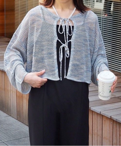 ■アイテムポイント ・ざっくりとした編地とMIXヤーンが魅力の2wayカーディガンです。 ・カラフルなミックスカラーの糸を使い、表情のある素材感がポイント。 ・ダブルリボンが女性らしく、お好きな結び具合に調節可能なので、幅広いインナーにマッチし旬のレイヤードスタイルに活躍。 ・前を開けて羽織りとして、リボン側を背中にプルオーバーとして、前後2パターンの着回しを楽しめます。 ・また自然と重心の上がるショート丈なので、ボレロ感覚でも着ていただけます。 ・春夏も快適なレーヨン100%でさらっとした着心地です。 ■スタイリングポイント ・キャミソールとのレイヤードで、ニットの落ち感を活かした着痩せスタイルが完成。 ・夏らしいヘルシーな肌見せも楽しめます。 ・コンパクト見えするデザインなので、パラシュートパンツなどのワイドパンツでメリハリのあるスタイルアップコーデも。 ・トレンド感の出るショート丈は、Y2Kファッションだけでなくロングワンピースとも好相性。 ・リボンは結ばずさらりと羽織るスタイルも涼し気でおすすめです。 ■サイズ 身幅【59cm】 肩幅【61cm】 総丈【38cm】 そで丈【42cm】 ※こちらの商品はワンサイズのみとなります。 -------------------------- 透け感:あり 裏地:なし 伸縮性:ややあり 光沢感:なし 生地の厚さ:薄手 ポケット:なし --------------------------- ※実店舗と発売時期が異なることがございます。あらかじめ御了承ください。 ※撮影場所やお使いのモニター環境により若干お色味が異なる場合がございます。 ※お取り扱いに関しましては、商品に付属のアテンションタグをご覧ください。 ※サイト上のカラー名と、お届け商品に記載されているカラー名が異なる場合がございます。 ※生産時期により色・素材・サイズ感など多少異なる場合がございます。予めご了承ください。 【お買い物をより楽しんで頂くために】 ▼商品のお気に入り登録 ♡のクリックで商品のお気に入り登録が完了! 完売カラー再入荷のお知らせ、ラスト1点のお知らせ、セールのお知らせを受け取ることができます。 ▼ブランドのお気に入り登録 新商品や再入荷のお知らせ等、いち早くブランドのお得な情報を受け取ることができます。 【tiptop+pocket/ティップトッププラスポケット】 デイリーに活躍するトレンドを取り入れたカジュアルアイテムを発信。 -tiptop- ベーシックとトレンドをMIXしたカジュアルスタイルをベースに "いま欲しい""いま着たい"が見つかる高感度なリアルクローズを提案します。 -pocket- シンプルで自然体な大人の女性へ。 デイリーに着られるベーシックなアイテムの中に、さりげなく今っぽさを効かせたラインナップ。 飾りすぎない大人カジュアルスタイルを提案します。