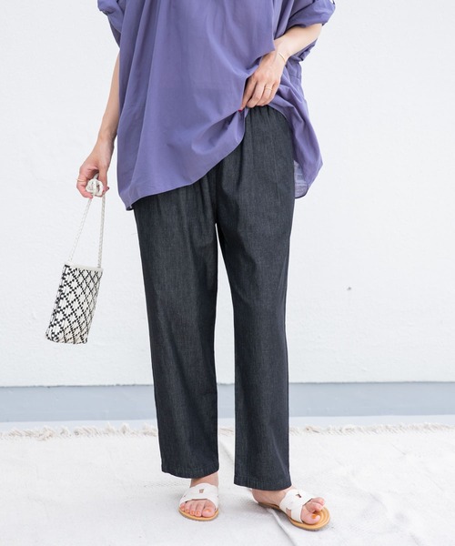 「夏に穿けるデニムパンツ」をコンセプトにデザインした薄手のライトデニムパンツは、これから気温の高くなる時期に押さえておきたいアイテム。 フロントにタックを入れ裾にかけてややテーパードになる美しいシルエットは、程よくルーズで大人の印象を与えます。 ウエストは紐付きのALLゴム仕様で、ゆとりがある分肌に張り付かずリラックスした穿き心地に。 定番デニムコーディネートが飽きた方や、ひと味違ったデニムコーディネートを楽しみたい方にオススメのボトムスです。 【2023 Spring/Summer】 ※直接日光に当たる場所に、長時間置かないでください。 ※濡れたままの放置は避けてください。 ※その他お取り扱いに関しましては、商品に付属のアテンションタグをご覧ください。 ※商品画像は、光の当たり具合やパソコンなどの閲覧環境により、実際の色味と異なって見える場合がございます。予めご了承ください。 ※商品の色味の目安は、商品単体の画像をご参照ください。 ▼お気に入り登録のおすすめ▼ お気に入り登録商品は、マイページにて現在の価格情報や在庫状況の確認が可能です。 お買い物リストの管理に是非ご利用下さい。 ----------------------------- 透け感:なし 伸縮性:なし 裏地:なし 光沢:なし ポケット:あり -----------------------------