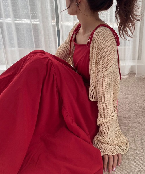 ~NICECLAUP 2023 early summer Collection~メッシュカーデとキャミワンピースがセットになったアイテム。ニットは前後着用可能になってます。ワンピースは広がりすぎないフレアのシルエット。肩のリボンで丈の調節も可能なので幅広く着て頂けます。伸縮性のあるカットソー素材なので、着心地も良いデザインになっています。トップスは夏も着やすいメッシュ素材で着丈が短いのがポイント。2wayで来ていただけるので前後どちらでも着用することができ、さらにリボンを開けて羽織としても着て頂けます。もちろん、別々でも使えるので、着回し力も抜群。■オススメスタイリングセットで着るのはもちろん、別々で着れるのがこのアイテムのポイント!トップスを単体で着用していただき、デニムやフレアスカートと合わせていただくと上品な大人コーデになります。ワンピースにシャツやカーディガンを羽織ったスタイリングもオススメ!Tシャツなどをレイヤードさせてカジュアルダウンさせた着方もオススメです。-------------裏地:あり伸縮性:あり生地の厚さ:普通生地の重さ:普通洗濯 :手洗い-------------※サンプルでの撮影のため、実際のものと仕様や色が異なる場合があります。※室内、室外での撮影のため実際より明るく映っていたり、暗く映っていたりする場合がございます。※品質表示を必ずご確認下さい。【商品のお気に入り登録】完売カラーの再入荷や、ラスト1点のお知らせ、セールの通知を受け取ることができます。【ブランドのお気に入り登録】新作入荷や再入荷情報など、ブランドの情報をいち早くお届けします。ぜひご登録ください♪