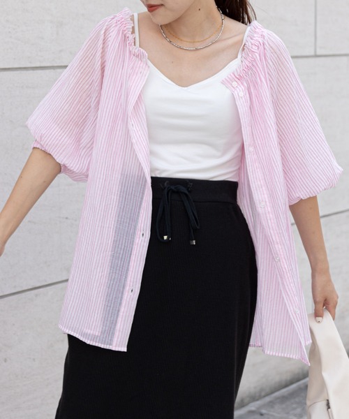 その日の気分でいろんな着こなしを楽しめる♩大人ガーリーにおすすめなオフショルブラウス■デザイン前後2WAY&オフショルでも着用できる、着回し力抜群のブラウス。ストライプ柄にすることで、ガーリーすぎないように仕上げました!程よく開いた首回りが、デコルテ部分をきれいに見せてくれて女性らしい印象に。肩紐付きなので、オフショルをキープできるのが嬉しいポイント◎腰回りが隠れる丈感で、さりげなく体型カバーできるのも♩シンプルコーデからカラーコーデまで幅広く着用していただけるカラー展開です。■素材汗ばむ季節も快適に着用できるさらっとした素材感。お家でのお手入れも簡単にできます。■お手入れ方法洗濯:洗濯機の非常に弱いコース(洗濯ネット使用、漂白剤の使用不可)タンブル乾燥:不可アイロン:不可■スタイリングシンプルにデニムパンツと合わせるだけで、大人カジュアルコーデに◎丈が長めなので、タックインせずにアウトスタイリングでも楽しめます!オフショルにせずに着用すれば、露出が苦手な方にも着用しやすいです。・・・・・・・・・・・・・・・・・・・・・・透け感:ややあり裏地:なし伸縮性:なし光沢感:なし生地の厚さ:薄い・・・・・・・・・・・・・・・・・・・・・・気になった商品はお気に入り登録がオススメです! 入荷情報や、クーポン情報が通知されるようになります。※画像の商品はサンプルです。 実際の商品と仕様、加工、サイズ、素材が若干異なる場合がございます。