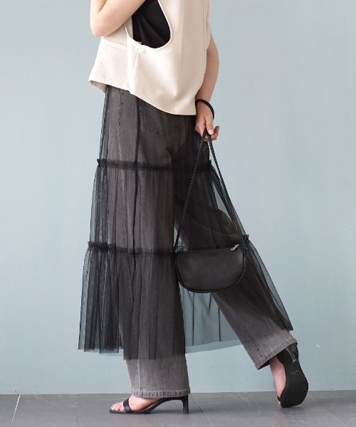 プラスアルファで魅せる。 合わせるだけで簡単に鮮度の高いこなれスタイルに仕上がる一枚。 軽いチュール素材を使用していて、ふんわりと広がるシルエットが涼しげで夏のレイヤードにぴったりです。 華やかなティアードシルエットがコーデをより映えさせてくれるアイテム。 ワードローブの幅がぐんと広がる万能スカートです。 洗濯:手洗い可 ※お洗濯の際はネットをご使用ください ※アイロンの際はあて布をご使用ください ▼デリケートな生地を使用しており、引っかけ・引っかかりやすい性質となっておりますので 着脱時や、アクセサリーやベルト、周囲の壁など表面の粗いものとの摩擦や引っかかりにご注意くださいませ。