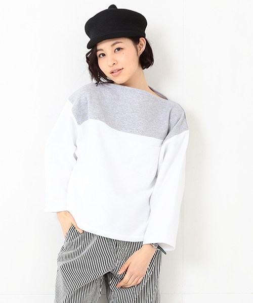 Hanesのスウェットのネック・ウエスト・袖口のリブを取り除き、ボートネックにリメイクしたひと品。2色のボディを組み合わせたカラーコンビネーション、ビックサイズのボディを使用したことで生まれたルーズなシルエットが特徴。シンプルなボトムスを合わせ、フォルムを活かして着たい1枚です。 les Briqu’a braque / レ・ブリカ・ブラック デザイナー、山瀬公子は1976~1991年アメリカ在住。1981年、青山にヴィンテージショップの先駆けともいえる『Par Avion(パラビオン)』第1号店オープンに従事。帰国後の1997年<les Briqu’a braque(レ・ブリカ・ブラック)>スタート、次いで2001年にはそのクチュールライン<MATRIOCHIKA(マトリョーシカ)>を発表しました。現在は両ブランドのデザイナーとして活動。ブランド名の les Briqu’a braque(レ・ブリカ・ブラック)は 「骨董品」「ガラクタの寄せ集め」という意味の仏語のスペルを違えて造った名前。 “女性だから”を基本にデザイナー自身が想う“普遍のスタイル”を表現することをデザインコンセプトとしています。