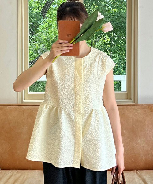 ぽこぽことした生地感がポイントのブラウスです✨ 肩を軽く覆うショルダー部分と ウエストのペプラムデザインで、 可愛く体型カバーも叶えてくれるブラウスです!
