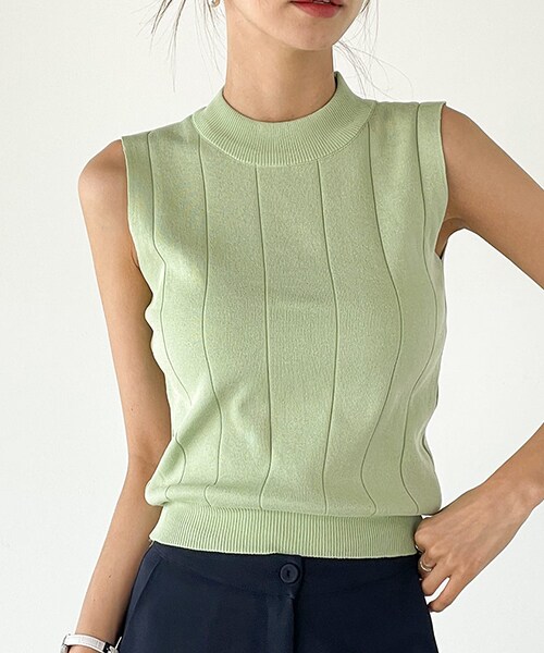 [COMMENT]豊富なカラー展開が魅力的なノースリーブです。端正なネックラインでレイヤードコーデにも♪柔らかい生地も快適でバミューダパンツと相性◎・ハーフネック ・ニット・ワイドリブ×リブヘム ・クロップド丈※明るい色味は透け感が気になる場合がございます。スキントーンの下着とお召しいただくと安心です。