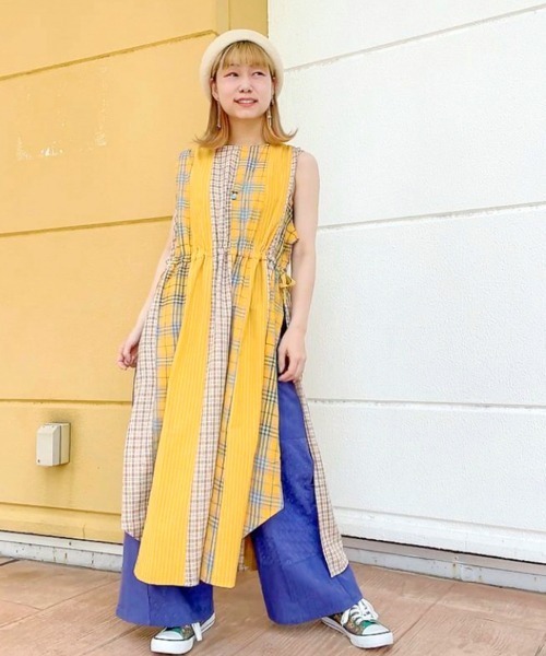 コーデの主役に大活躍! チェック柄とストライプ柄のパッチワークノースリーブワンピース。 ゆったりとしたオーバーサイズで、リラックス感のある着心地。 両サイドにロングスリット入りなので、ワイドパンツやロングスカートとのレイヤードスタイルが楽しめます。 ウエストのドローストリングでシルエットを変えられるのも◎ 涼やかなコットン素材で、夏のカジュアルコーデに◎ ※こちらの商品は1点1点職人による手作りとなります。その為、生地の取り方により柄の配置や形・色合いなど若干異なる場合がございます。あらかじめご了承ください。※屋外での撮影画像は、光の当たり具合で色味・カラーが違って見える場合がございます。商品のカラーは、スタジオ撮影の画像をご参照ください。 Amina Collection Co.,LTD.
