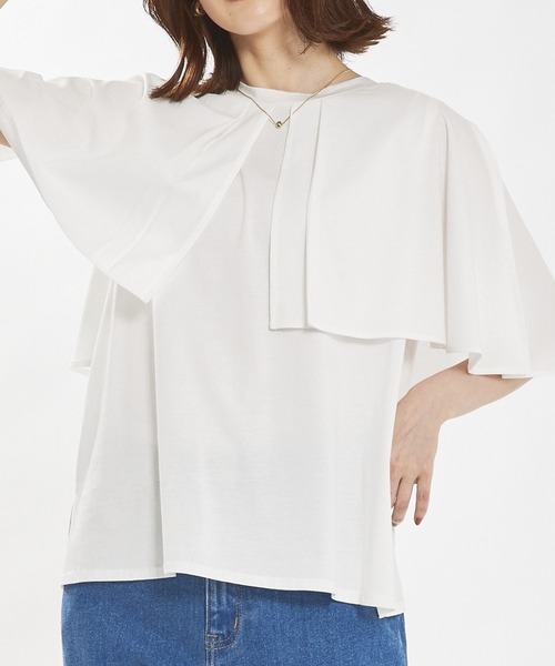 【今年も登場!】マルチWAYのデザインTシャツご好評につき今年も予約開始!【Design】ケープのような衿がポイントのTシャツ。ケープの肩線はスナップで開閉可能で腕を出したり隠したりできます。前後着用も可能で何通りもの着方を楽しめる1枚です。【Fabric】夏に嬉しい接触冷感素材使用。シルケット天竺というコットン100%でお手入れも楽チンです。コットンなのに、やや光沢があるのも大人に嬉しいポイント。【Styling】デザインを楽しんで、シンプルなワンツーコーデはもちろん、サロペットなどのインナーにもおススメ。カットソーですが、ブラウスとして通勤にも◎**********************透け感:ホワイトのみややあり裏地:なし伸縮性:あり光沢感:なし生地の厚さ:やや薄手**********************