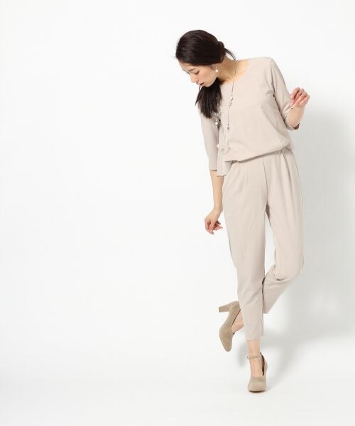 一枚でコーディネートの完成するオールインワン。バックシルエットが印象的なアイテム。高級感のあるきれいめ素材が魅力。ウエスト後ろ部分はゴム仕様なので、楽に着用していただけます。羽織り要らずの6分袖デザインもうれしいポイント。