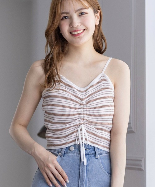 この夏大活躍!フロントドロストキャミソール【デザイン】フロントのドロストデザインが、キャミの丈感調整ができるのでお好みの長さで着ていただけます!また、ボーダーが可愛らしいので1枚でもお使いいただけます。【素材感】伸縮性のあるレーヨンニット素材伸縮性:あり / 透け感:あり / 裏地:なし 水洗いによる洗濯不可 / ドライクリーニング可【コーディネート】シアーシャツなどに合わせてインナー見せるのが◎インナー1枚にデニム合わせでカジュアルライクにも!【※お取り扱い上のご注意】1:モニター環境等により実際の商品と多少色味が異なって表示される場合がございます。予めご了承下さい。2:屋外で撮影された商品は、天候により多少実際のカラーと異なる場合があります。商品のカラーはトルソー(マネキン)の商品画像をご参照ください。3:濃い色の商品は、お洗濯や摩擦等による移染にご注意ください。4:末永くご愛用頂く為に、アテンションタグ・洗濯ネームを必ずご確認の上、着用又はお取り扱い下さい。5:生産時期により、色、サイズ、デザイン、素材の質感が多少が異なる場合がございます。あらかじめ御了承下さいませ。