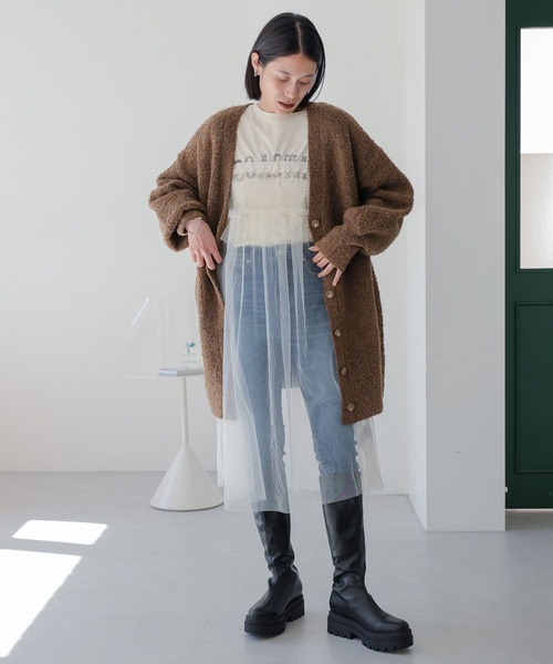 ■素材特性■目が繊細で軽さのあるチュールなので、着た時にふんわりと空気をはらむ様な雰囲気が出ます。■デザイン■程良いシアー感で、ぺチコートを合わせると可愛らしくパンツ合わせのレイヤードをした時にはカジュアルに、マルチに着用いただけます。
