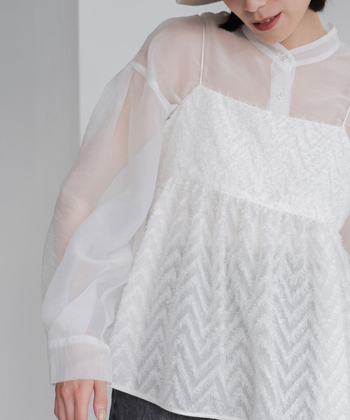 ■素材■ ポリエステルとナイロンを交織したシアー素材を使用しています。 しなやかでハリがあり、程よい光沢感が特徴の素材です。 ■デザイン■ 袖にタックをいれ、立体的に仕上げたのがポイントのチュニック丈シャツになります。 シアー素材なので暑い夏も清涼感があり、冷房対策など、羽織としても活躍するアイテムです。 ■スタイリング■ パンツとのレイヤードはもちろん、ミニボトムと合わせると今年らしいスタイリングに。インナーにはカップツキキャミなどを合わせると華奢見えに。柄ものを透かせるのもオススメです。