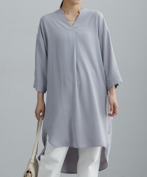 【Be praised】ーーー明日ちょっと褒められる服ーーー大人トレンドを意識したこだわりのアイテムと着こなしでアナタの毎日に輝きを。ただシンプルできれいなだけじゃ物足りない。カジュアルすぎず、スタイリッシュで大人の品性を感じる着こなしに。そんな、こなれたオシャレを楽しむ女性に寄り添う、 新鮮なリアルクローズをご提案します。■デザイン・リラックス感のあるゆったりシルエットは”スキッパー衿”で大人の抜け感を演出・サイドタックがどこから見ても立体的なシルエットを実現・体型カバーも叶うロング丈は重たく見えない表情豊かなデザインがポイント■素材・華奢見えが叶う、とろみ素材・きれいめにもカジュアルにも着られる上品な素材■おすすめのスタイリング・スキニーやテーパードなど、スッキリとしたパンツと合わせたメリハリのあるスタイリング<仕様>ポリエステル100%(織物)透け感:ややあり ※オフホワイト伸縮性:なし生地の厚み:普通光沢感:ややあり裏地:なし季節:春・秋シルエット:ゆったり<洗濯方法>洗濯機OK■キーワード20代、30代、40代、きれいめカジュアル、きれかじ、オフィスカジュアル、キレカジ、チュニック、ブラウス、夏、大人、大人カジュアル、春、通勤カジュアル