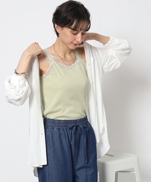 チラ見せが可愛い♪ 【デザイン】 胸元と肩ひもの上品レースがフェミニンな大人可愛いデザイン! 程よいフィット感のあるコンパクトなシルエットです。 【素材】 ストレッチが利いて快適な着心地の綿混テレコ素材。 ストライプ柄のような凸凹としたあぜが、表と裏に交互に現れる見た目が特徴。 モデル情報:身長168cm B76 W58 H86 着用サイズ:02(M) 店舗へのお問い合わせ商品番号:741-17306 ●製品寸法: 02(M):総丈60cm B49cm 肩幅76cm 03(L):総丈61cm B50cm 肩幅78cm 備考: