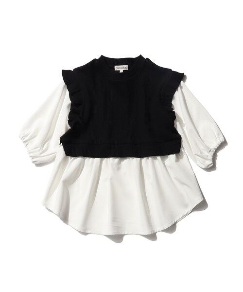 【デザイン】 人気継続のベストドッキングデザイン! 肩のフリルがガーリーな印象なので、シンプルな無地同士の組みあわせもオシャレに決まりますね♪ 清潔感のある白シャツとレイヤードしたようなデザインはオトナっぽいブラックと、女の子らしさが増すミントの2色展開です。 【素材】 ほどよい肉感のある畝が特徴のカットソー素材と布帛生地をドッキングしたデザインです。 店舗へのお問い合わせ商品番号:122-17329 ●製品寸法: 11(110cm):着丈50cm B66cm 袖丈23cm 肩幅29cm 12(120cm):着丈53cm B71cm 袖丈26cm 肩幅31cm 13(130cm):着丈56cm B76cm 袖丈29cm 肩幅33cm 14(140cm):着丈59cm B80cm 袖丈31cm 肩幅35cm 備考: