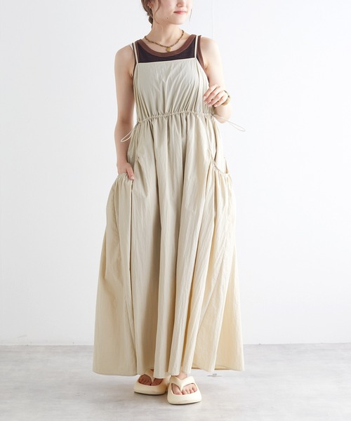 前後どちらでも着用可能な優秀ワンピ ▼デザイン ・ビッグポケットがポイントのキャミワンピース ・ウエストをスピンドルでキュッと絞るとスタイルアップ効果◎ ・肩紐の長さは調整可能で身長問わず楽しめます ・スカート部分には裏地付きで透ける心配もありません ・カジュアルながらも裾がふわっと広がるシルエットが可愛い ・気分によって前後どちらでも着用可能 ・合わせるインナーによって雰囲気を変えられます ▼コーディネート カジュアルなキャミワンピースはTシャツとの相性抜群。ボーダーや花柄など柄アイテムと合わせると一味違ったコーディネートに。カシュクール側を前にして着用する時はフロント部分にデザインのあるトップスと合わせるのがおすすめ。今季はシアーブラウスなど女子っぽアイテムをインするとこなれ感がアップ。チューリップハットやバケットハットをプラスしてもお洒落。 -------------------- 裏地:スカート部分あり 透け感:エクリュややあり 厚さ:薄め 伸縮性:なし洗濯方法:手洗い可 -------------------- ※商品の色は着用写真ではなく、商品写真をご参照ください。また、可能な限り実物に近いカラーにて掲載しておりますが、ご使用のパソコンおよび携帯電話の閲覧環境によっては、実際の色味と異なって見える場合がございます。予めご了承ください。 ※商品サンプルにて撮影しております。若干の仕様変更が生じる場合がございます。 【お買いものにおすすめの便利機能!】 ★商品のお気に入り登録 完売カラーの再入荷の時や、ラスト1点の時、セールになった時にお知らせします。 ★ブランドのお気に入り登録 商品や再入荷、セール情報など、いち早くブランドのお得な情報を受け取ることができます。 ぜひご活用ください! "