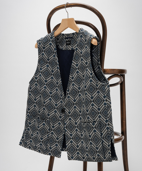 ■デザイン ヴィンテージライクなブランケットベストをデザインベースに、1つボタンをあしらったベスト。 ボックスシルエットで合わせやすく、Tシャツからシャツ、ニットなどベーシックアイテムのレイヤードにプラスするアイテムとして重宝します。細かで上品な印象の柄なので、コーディネートのアクセント使いとしても最適です。 ■素材 ジャカード織の総柄素材を採用。 ブランケットをイメージとした柄、素材を使用しています。程よく厚みがあるので、織り柄に立体感があり、着用映えする素材感です。 ********************** 透け感:なし 裏地:あり 伸縮性:なし 光沢感:あり 生地の厚さ:普通 ********************** 【スタッフ着用コメント】 《スタッフA》 身長:181cm/体重:58kg/普段サイズ:L/着用サイズ:L サイズ感:ジャストルーズなサイズ感。 素材感:風合いのある素材感 着心地:ゆとりのあるサイズ感なので着やすく、分厚いものでなければ重ね着時も窮屈さはありません ********************** 【ご注意】 ※照明の関係により、実際よりも色味が違って見える場合があります。 またパソコン・スマートフォンなどの環境により、若干製品と画像のカラーが異なる場合もございます。 ※商品の色味は、商品アップ画像をご参照ください。