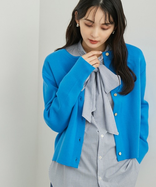 きちんとカーデをリラクシーなムードに。コーデを華やかに見せる一枚。【素材感】・廃棄予定の衣料品や残反等を回収し、新たに繊維にするサーキュラーエコノミーのRENU(レニュー)素材を使用。【デザイン・シルエット】・ベーシックな長袖クルーネックカーディガン。・プレッピーな金ボタンデザイン。・肩の切り替えをドロップしたリラックスシルエット。【カラー】・アイボリー、ネイビー、ブルー、オレンジのすっきりカラーを4色で展開。【スタイリングポイント】・前立てを閉じてプルオーバー風に着こなしてもOK。・首元にプリントスカーフを巻くと素敵。・総柄ワンピースの羽織に。【おすすめの着用シーン】・お仕事・授業参観・お出かけ、ショッピング・ドライブ-----------------------------裏地:なし透け感:なし伸縮性:あり生地感・厚さ:普通季節:秋-----------------------------※撮影時の光、お使いのモニター環境によって色の見え方が違う場合がございます。※モデル身長:161cm 着用サイズ:38