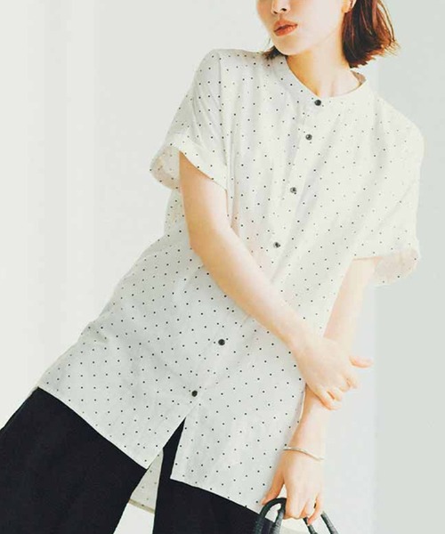 気持ちが上がる、光に映える彩りいろいろ。ビー玉のようなきれいな彩りを、リブイン得意のダブルガーゼで。からだのラインを拾いにくい風が抜けるようなシルエットや折り返した袖口、前後差のあるすそなど、細見えする工夫が盛りだくさんです。暑くてテンションが下がりがちな日も、涼やかに気持ちよく、着映えるおしゃれを楽しんでくださいね。ボタンで全開できるデザインなので、タンクトップなどをインに重ねてはおって着こなすのも素敵です。