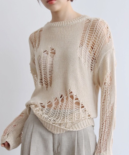 【DESIGN】・所々で経糸を抜いたシースルーデザインが印象的な クルーネックニット。・一枚で存在感抜群。【STYLE】・足元はスニーカーサンダルやグルカサンダルがおすすめ。・バニティバッグやミニバッグを携えるのも◎【ROOPTOKYO ZOZOTOWN お買い物ガイド】▼商品をお気に入り登録!完売商品の再入荷やラスト1点の通知、セール開始時にお知らせ!▼"ROOPTOKYO(ループトーキョー)"をお気に入りブランドに登録!新商品や再入荷など、ブランド最新情報をいち早くお知らせ!是非、ご活用いただきお買い物をお楽しみください!
