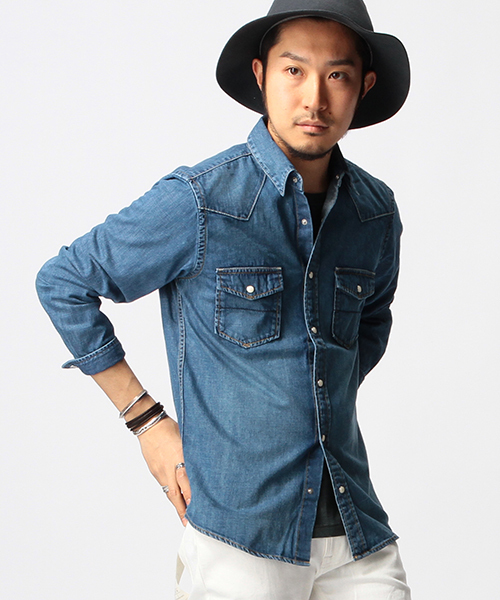 クリーンな印象のデニムシャツの登場 デニム人気が盛り上がる中、改めて注目のアイテムとなったデニムウエスタン。着こなしの幅は非常に広いですが、今季はテーパードの利いたジーンズと白スニーカーというスタイリングもお勧めです。 model サックスブルーH173cm W62kg Size : M インディゴブルー H174cm W57kg Size : M 店舗へお問い合わせの際は下記品番をお伝えください。 品番:11-11-2273-791