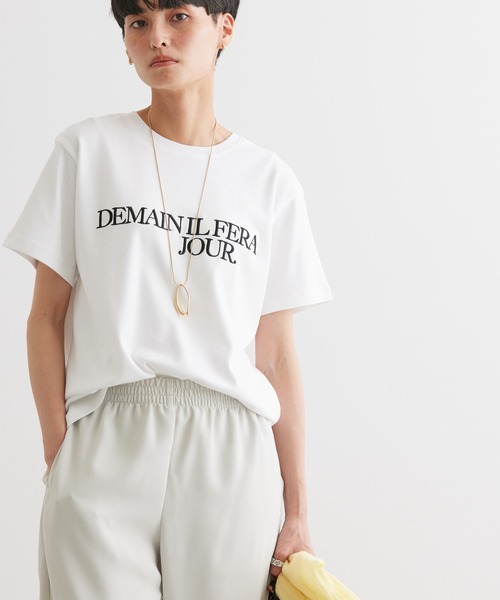 ■デザイン ・立体感のある刺 ロゴデザインが印象的なTシャツ。 ・活字ロゴを敢えてモノトーン配色で施すことにより、シンプルでスマートな印象に◎ ・カジュアルとほんのりきれいめ、どちらのスタイリングもしやすい一枚。 ■素材 ・透けにくいしっかりとした素材。 ・上質な糸を使用しており、ハリ感やほんのりとした艶感がある素材。 ***サスティナブルアイテム*** 環境に配慮した染色技法で生産したアイテムです。 ・水、ガス、電気の消費量を削減。 ・塩素を使用せず、不純物の排出を削減。 ・シワ跡の少ない仕上がりのため、生地の廃棄量が減少。 ■カラー ・一枚でもインナーでも使いやすい、オフホワイトとブラックの2色展開。 【洗濯表示】 40℃以下の弱い洗濯機洗い可/酵素系漂白剤可/タンブル乾燥禁止/日陰つり干し/150℃以下のアイロン仕上げ可/石油系ドライクリーニング可 透け感[無し] オフホワイトは[やや有り] 裏地[無し] 伸縮性[有り] 光沢感[無し] 生地の厚さ[普通] 付属品[無し] ポケット[無し] ●製品寸法: M:バスト48cm 着丈57cm 袖丈18cm 肩幅41cm 裾幅50cm L:バスト51cm 着丈59cm 袖丈19.5cm 肩幅42.5cm 裾幅51cm 備考: