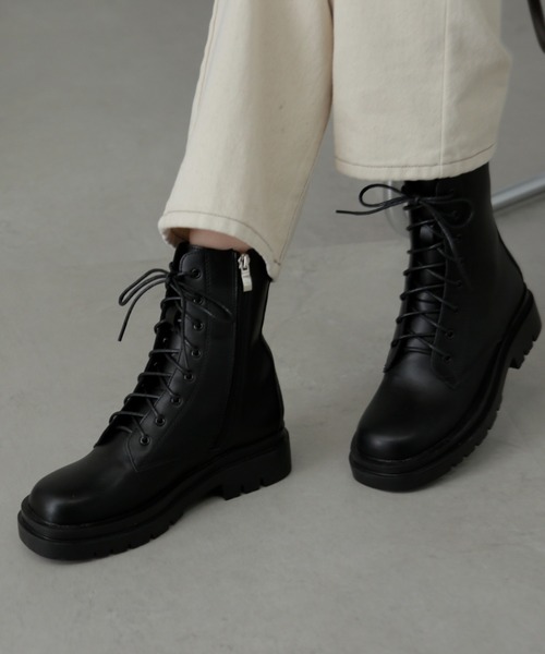 足元に程よいボリュームを出せる!レースアップブーツ。ベーシックなデザインとカラーは飽きがこなく、デイリーに活躍できる1足。内側のファスナーで形を崩さずに脱ぎ履きできる仕様。カジュアルコーデはもちろん、フェミニンなスカートやワンピースに合わせれば、こなれ感のあるMIXスタイルが完成します。※モデルの着用画像の場合、光の当たり具合により、実際の色味と異なって見えることがございます。色味は、商品単体の画像をご参照ください。