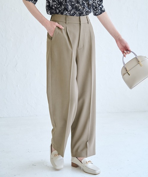 暑さの残る晩夏に取り入れやすい接触冷感パンツ。【素材感】・再生ポリエステルを使用した、サステナブルなアイテム。・接触冷感素材で快適な穿き心地をキープ。・お家で洗えるマシンウォッシャブル対応。【デザイン・シルエット】・太すぎず取り入れやすいセミワイドパンツ。・ワンタック入りで立体的な仕上がり。・後ろウエストはギャザー使い。・同シリーズでジャンスカ(品番:GDE53120)、ジャケット(品番:GDV53130)も展開。【カラー】・モカ、ネイビーの2色展開。【スタイリングポイント】・足もとはパンプスでマスキュリンなルックが完成。・シックなカラーは通勤にも使いやすく、ジャケットやシャツも合わせやすい。-----------------------------裏地:なし透け感:なし伸縮性:なし生地感・厚さ:普通ポケット:ありウエスト:後ろゴム季節:夏・春-----------------------------※撮影時の光、お使いのモニター環境によって色の見え方が違う場合がございます。※モデル身長:165cm 着用サイズ:38