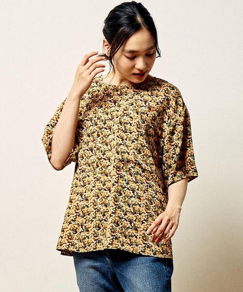 女性らしさたっぷり、レトロなフラワーフルーツプリント柄。 ゆったりとしたサイズ感と胸元にある大きなポケットが特徴的な半袖のTブラウス。 インでもアウトでもスタイリングの巾が広がる主役アイテム◎ 両サイドに深めのスリット、バックネックに小さな釦の開きのあるデザインです。