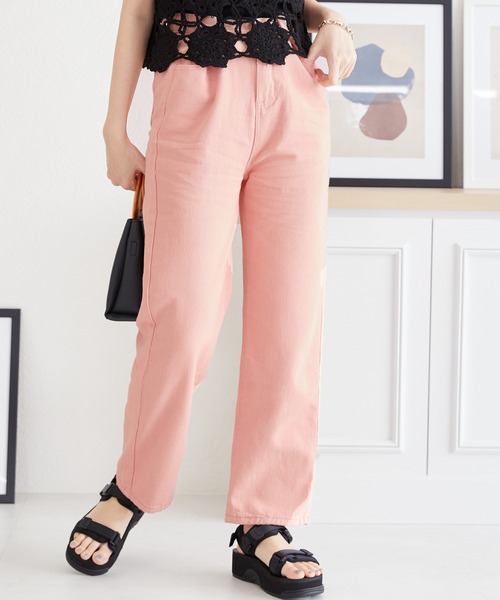 程よいルーズさとハイウエストデザインで脚長効果抜群のデニムはウエストのホックでサイズ調節可能。ショート丈のトップスと合わせたれば今年らしさあふれメリハリのあるコーディネートに。選べるM,Lの2サイズ展開。
