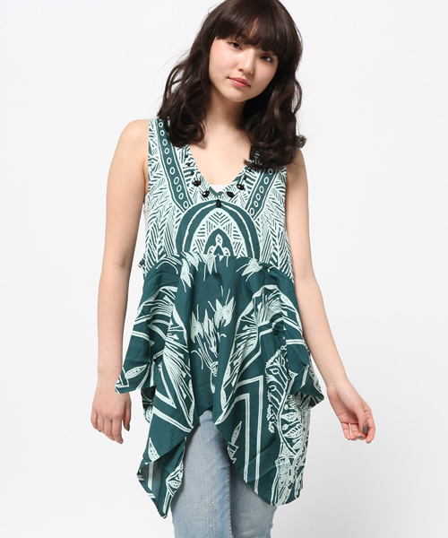 モノトーンやシャープなカラーリングで展開した線画プリント。ドレープと変形した裾で動きをつけて軽やかな印象のノースリーブトップスです。胸元のさりげないビジュー使いもポイント★ボヘミアンスタイルにもおすすめの1枚です◎※こちらの商品は、職人による手作りとなります。その為、形や色に多少の誤差が生じる場合があります。あらかじめご了承ください。Amina Collection Co.,LTD.