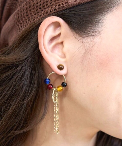 惑星をイメージしたカラフルなピアス。動くたびに揺れるメタルチェーンもポイント。顔まわりを華やかに彩ります。 ※こちらの商品は1点1点職人による手作りとなります。その為、形や色合いなど若干異なる場合がございます。あらかじめご了承ください。 Amina Collection Co.,LTD.