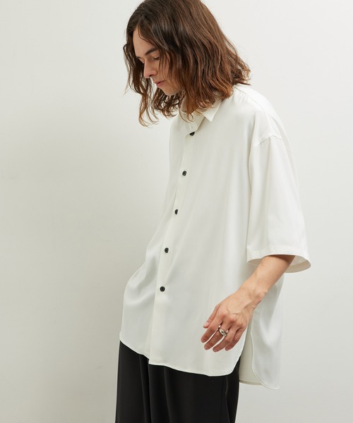 【 トレンドのビッグシルエット】ドレープスリットビッグシャツ■素材、機能肌触りが良くドレープ性の強いポリエステルを使用し、光沢感が上品な素材です。■シルエット、デザイン大きくゆとりを持たせた身幅にドロップショルダーはトレンド感のあるシルエットになっており、深く入るスリットシンプルながらポイントとなるデザインになっています。生地を贅沢に使用し、しっかりとシルエットを楽しめるアイテムです。■カラー定番のブラック、ホワイトとニュアンスカラーのラベンダーがコーディネート映えするカラー展開になっています。■スタイリングビッグサイズのシャツなのでフレアパンツでメリハリのあるスタイリングはもちろんワイドパンツで合わせる雰囲気抜群なコーディネートもおススメです。裏地:なし透け感:なし伸縮性:ややあり生地感・厚さ:普通ポケット:なしその他仕様:なし【モデル着用サイズ】MEN:身長175cm 着用サイズL※撮影場所やライティング、お使いのモニター環境によって色の見え方が異なる場合がございます。※商品のカラーは詳細画像の色味をご参照ください。
