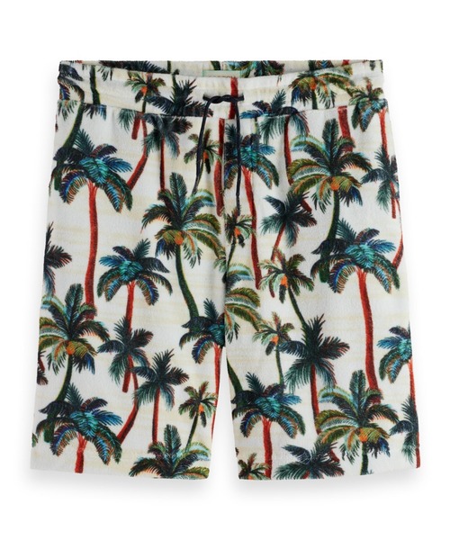 ループパイル地にパームツリーをプリントしたテリークロスショーツ。 ループパイルはふっくらと柔らかく、吸水性も◎。 同素材シャツとのセットアップ対応可。 ウエストゴム+ドローコードで調整可能。バックポケットあり。レギュラーフィット。 ---------- 2023Spring SCOTCH & SODA ---------- 2023年Summerコレクション-Park in Bloom-は、アムステルダムの象徴であるフォンデル公園からインスピレーションを得ています。 アムステルダムを彩る花々が伝える新しい季節を讃えたSpringコレクションのストーリーを進化させ、ミツバチ、咲き誇る花々、公園に息づく生命の尊さを表現しています。 ユニークな花や果実のグラフィック、ワークウェアのディテールを、タイダイカラーやニュートラルカラーと融合させ、夏のモダンなワードローブを提案します。 そしてこの春夏、ウサギ年を記念して登場するのはLooney Tunesとのカプセルコレクション。 Bugs Bunnyの陽気なグラフィックがTシャツやスウェットアイテムに落とし込まれています。